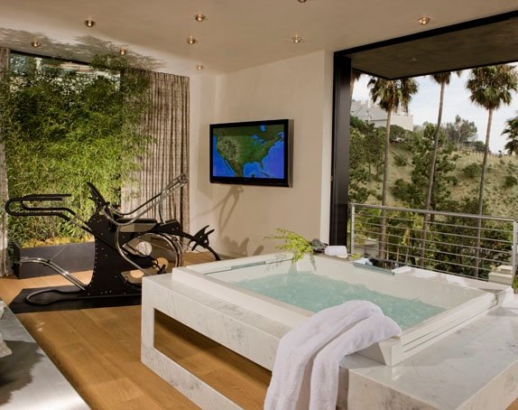 Guests are introduced to the property through a wood and glass 12’ high gate. This opens to a secluded courtyard lined with lush planters and tall fountains. Off of this entry space are the main rooms of the home. On the ground level, this includes several thousand square feet of contiguous living, dining, and family room, which together can hold large gatherings. The top floor features a grand master suite with room for a gym, an office and a sitting room. There is also a spacious dressing room, his and hers bathrooms, a spa room with large tub and an outdoor deck with stairs to access the pool and spa below.